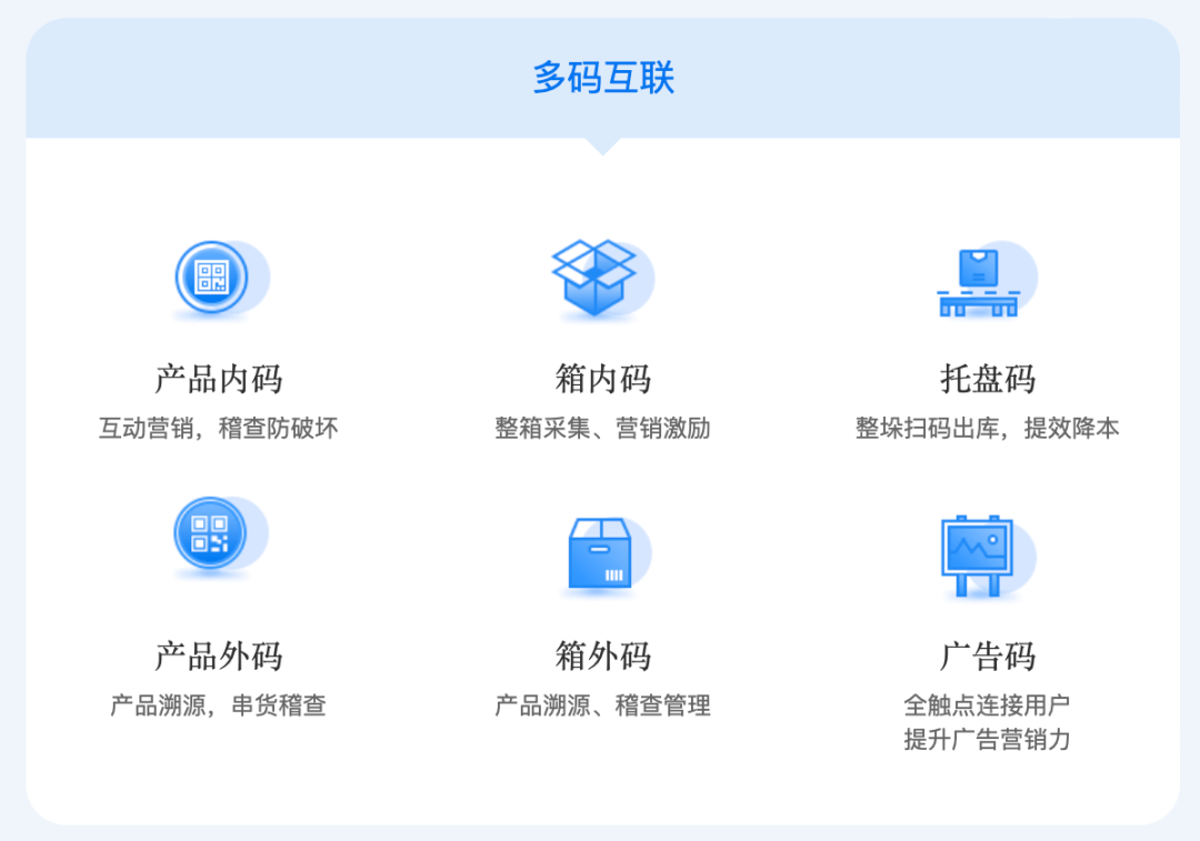 除此之外,爱创还拥有创新“一物多码,多码关联”技术,以满足日用品行业不同品类的个性化需求,如下图:
