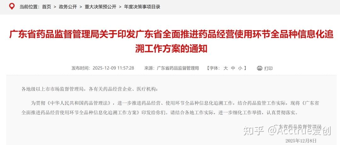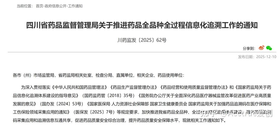 药品安全无小事,全程追溯是关键!近期,四川省药品监督管理局发布《关于推进药品全品种全过程信息化追溯工作的通知(征求意见稿)》,广东省药监局同步印发《全面推进药品经营使用环节全品种信息化追溯工作方案》,两大医药大省密集出台政策,标志着我国药品信息化追溯体系建设进入“强执行、全覆盖”的新阶段。