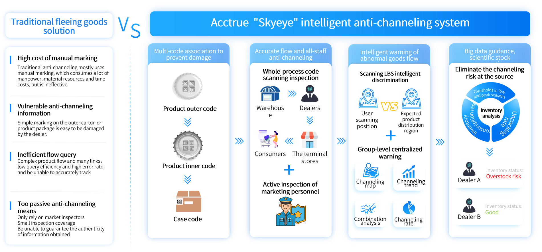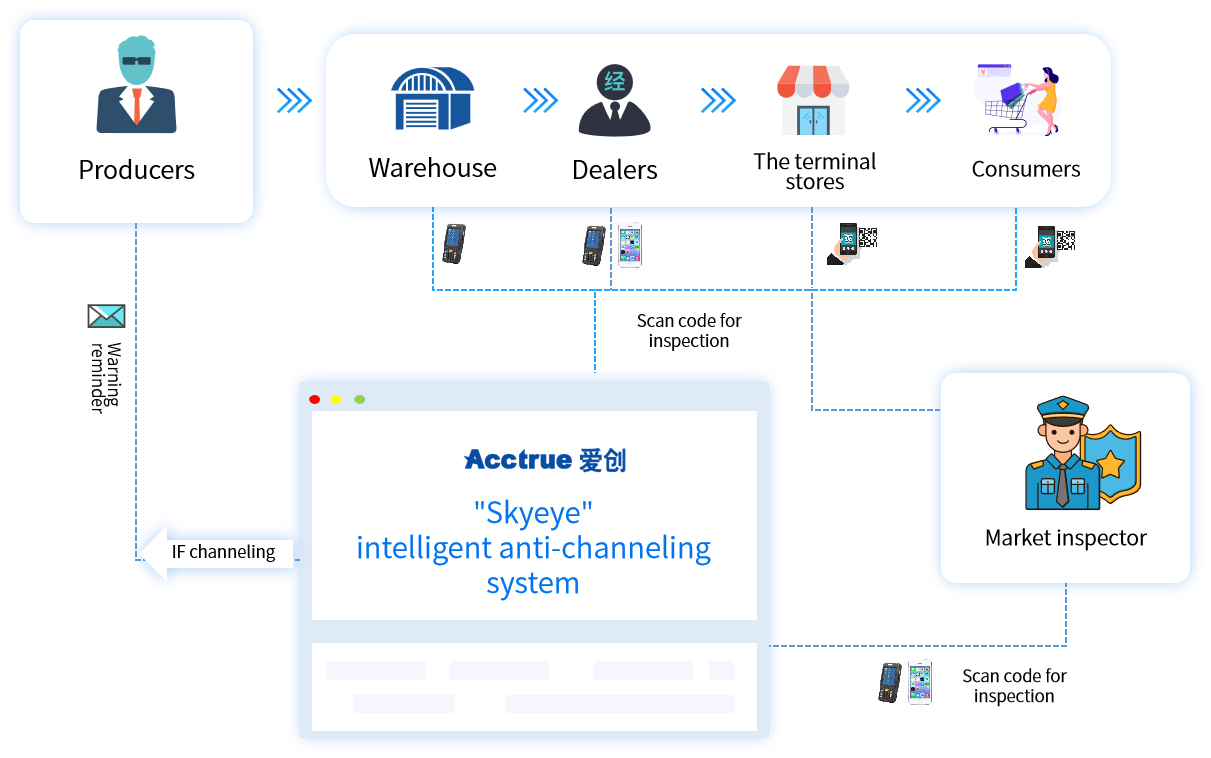 Acctrue "Skyeye" intelligent anti-channeling system accurately grasps the flow direction, flow rate and flow rate of the whole life cycle of the product, realizes the real-time tracking of channeling goods with the "all-scenario inspection + all-staff anti-channeling", and quickly fixes the evidence chain by scanning the code with one key, forming a powerful threat to illegal dealers!