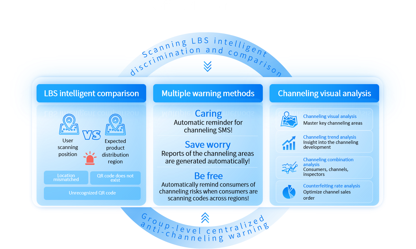 Through the code scanning and inspection of dealers, terminal stores and consumers, LBS automatically compares and judges, realizes the whole-process channeling automatic abnormal warning, and helps the brand owners to crack down on malicious channeling quickly and severely. At the same time, the system can also provide customers with the channeling map, the channeling trend, the channeling rate, and the combined visual report analysis of consumers, channels and inspection, and help to display the centraliz